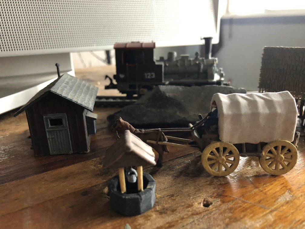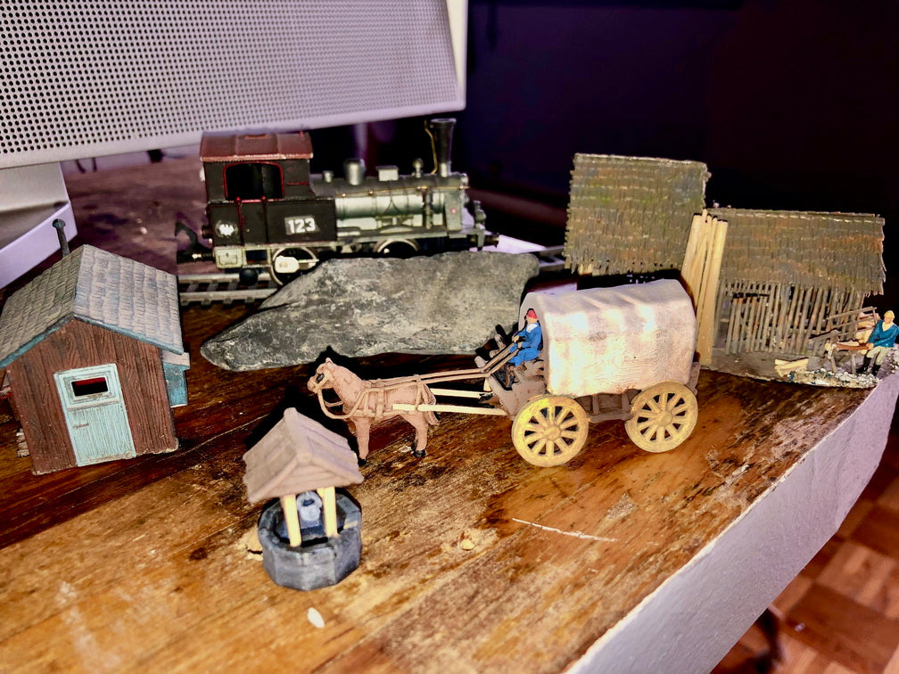 | It goes under my Christmas tree , I’m not sure why I didn’t finish painting the horse , my locomotive doesn’t work so I’m adding some train robbers that will block the tracks with logs |
