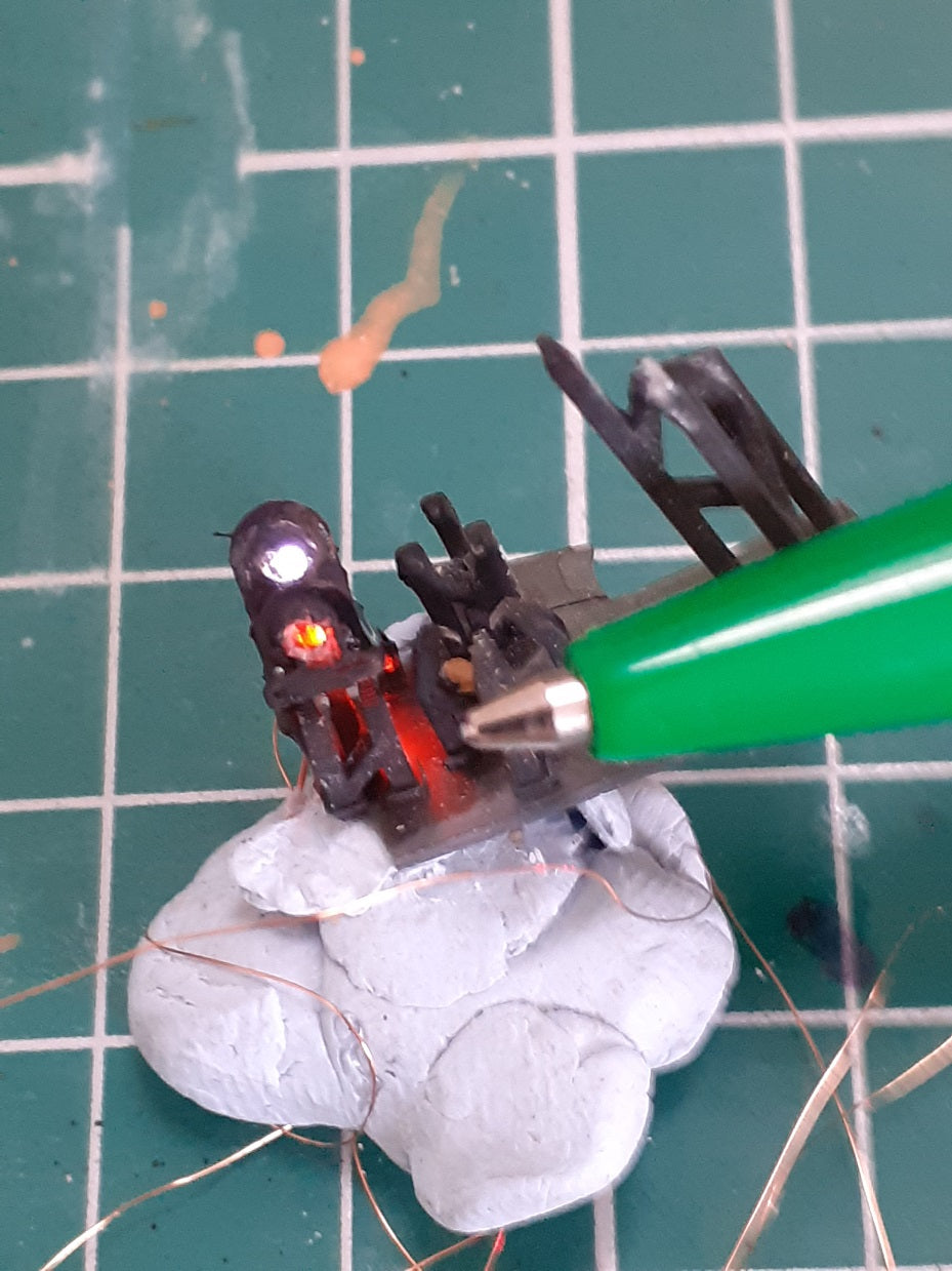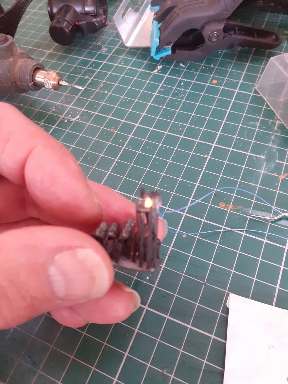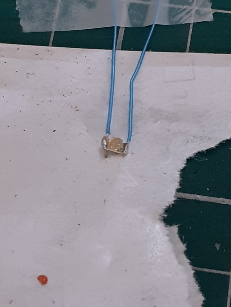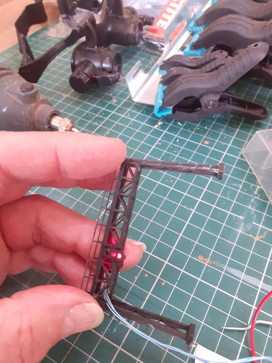 Adding lights to Outland models signals Yes you can do it. Step by step. Led smd led used. Do not have the soldering iron too hot. Drill out the signals to fir the led. Solder wires I use a sticky label and tape to hold the wires. Feed the wires into the back of the signal. (Some grinding is required here to get the gap. A drop of glue and black paint and you are finished. See pictures.