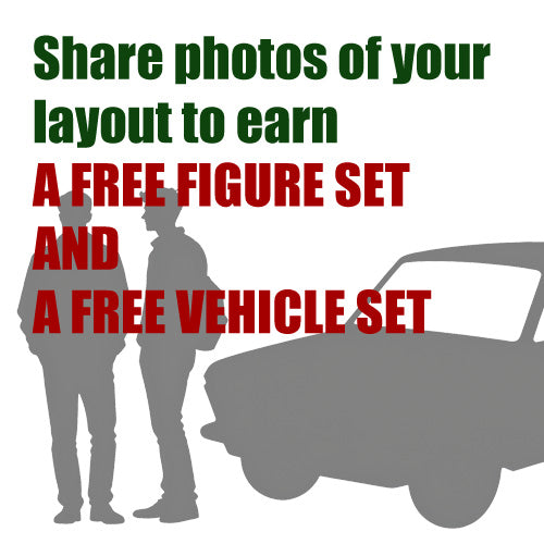 Submit pictures of your beautiful layout to our gallery to earn a figure set and a vehicle set for FREE.