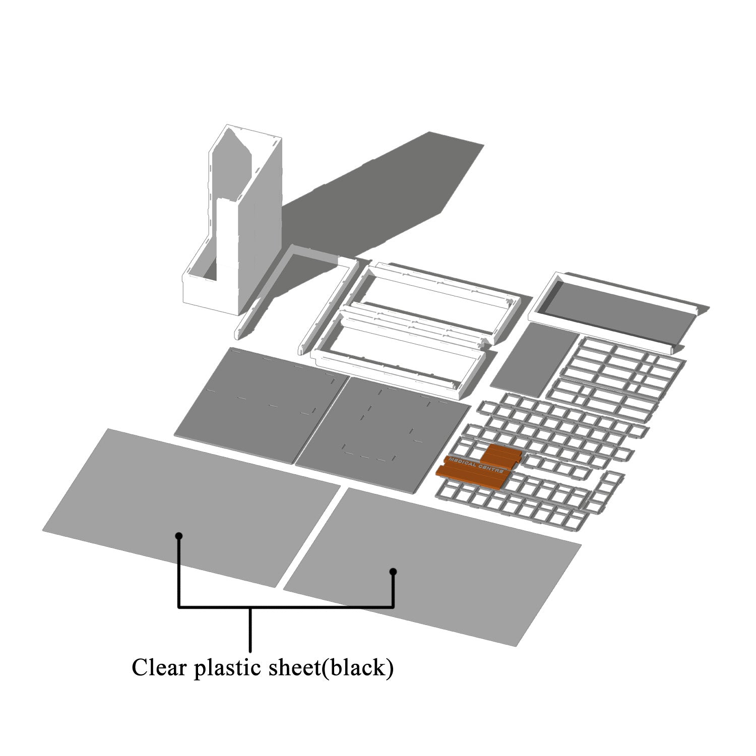 A modern style multi-level medical centre with car parking lot, it will fit well in a modern city layout or an ambulance action scene. a dark clear plastic is included for use as glass if you need it.