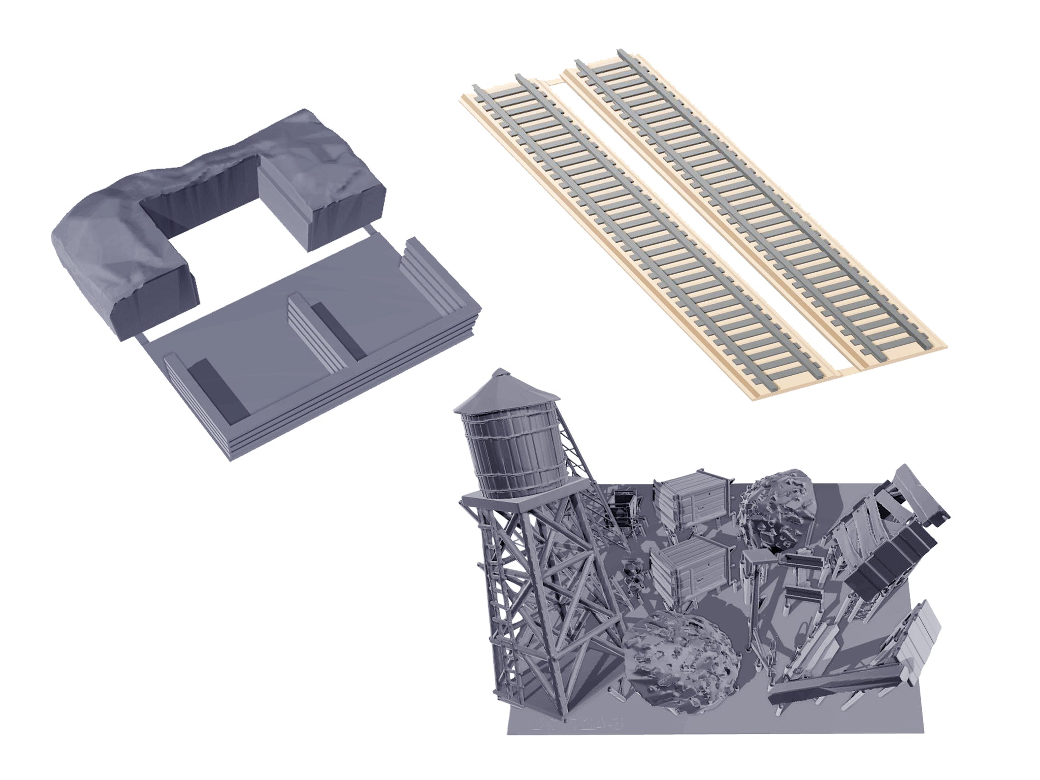 This kit includes: mine entrance(opend/closed), mine track x2, ore bin, ore pile x2, ore cart and loads, track stop, pully, outhouse x2, water tower
