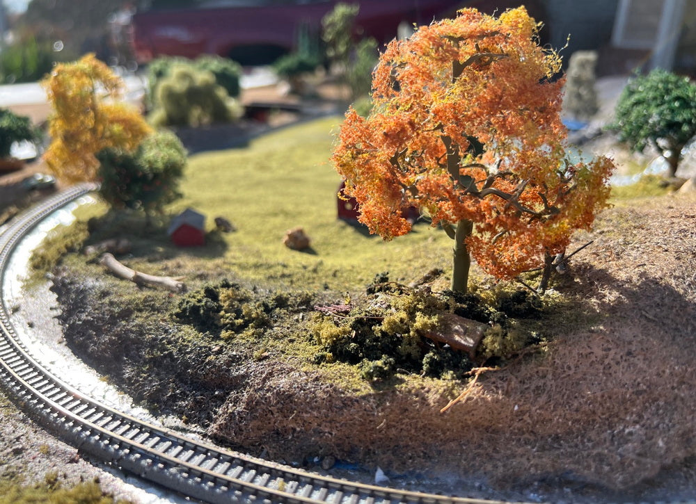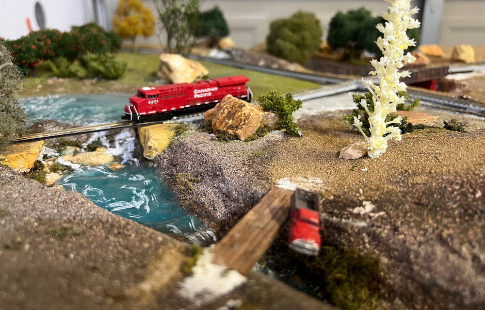 | A wonderful country view, with Canadian Pacific #9371 and old farmer Pete Henderson driving his lovely red truck off the bridge. |