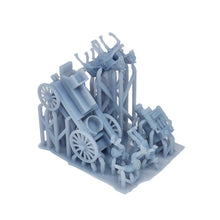 This item includes: a horse-drawn fire engine(in 2 parts), 2 horses w a rider, 3 firefighters